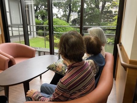 スタッフが事務所から出るとソファーに仲良し3人組さんが並んで座られていました。