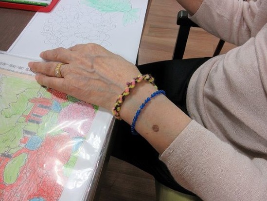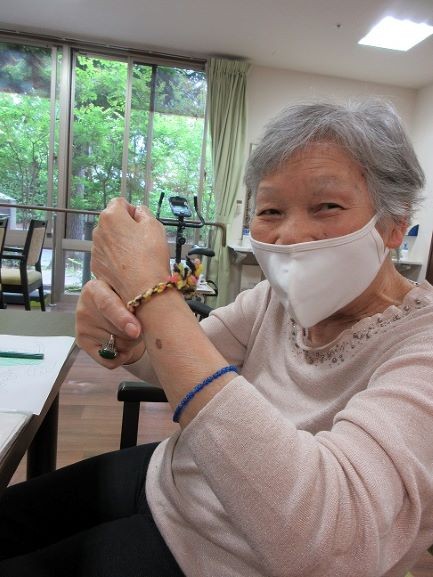 ご自分で作成されたビーズのブレスレットと重ね付け