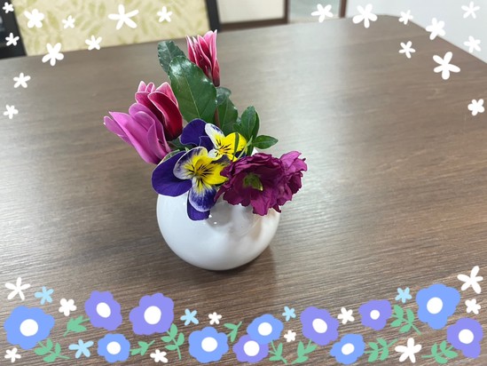 玄関先に置いていた鉢植えの花をデイルームに飾りました
