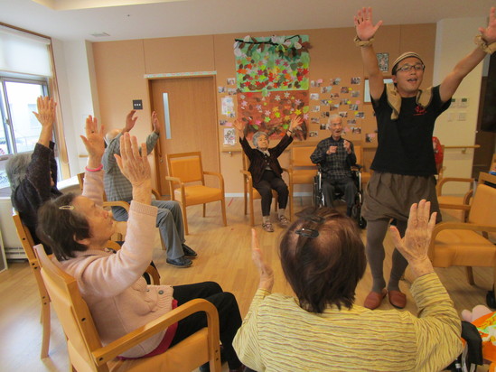 音楽と掛け声に合わせて手足を動かしているうち、表情もほぐれてきます。