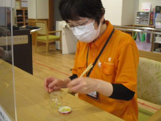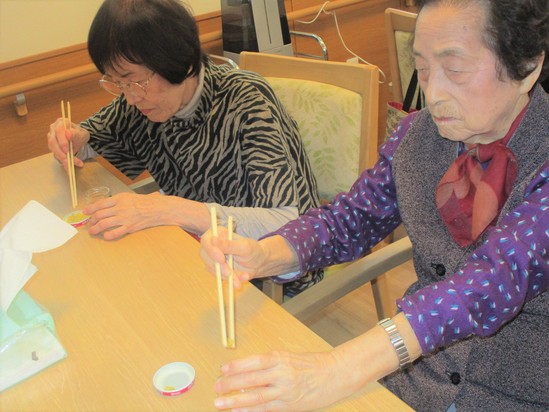おやつの後は、お箸レクリエーションの始まりです。