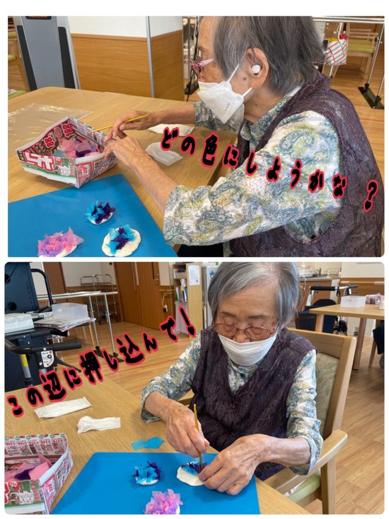 O様はF様がカットしたおはながみを丸く伸ばした紙粘土に埋め込みます