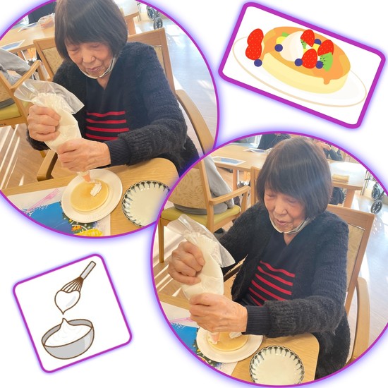 以前の敬老会の時にホットケーキミックスを使用したどら焼きを作って大好評だった為、今回はホットケーキミックスを使ってケーキを作りました