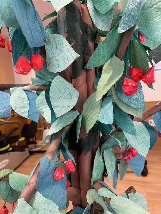 褒めていただけてスタッフもご機嫌です(笑)このさくらんぼの木、朝になると鳥がついばむのか、実が下に落ちているんです、そこまでリアルなんです(単に粘着テープが弱いだけですが・・・。) 桜の木から頑張って作品を作ってきましたが、厨房さんがラップの芯をたくさん提供してくださるので、次は何を作ろうか考案中です。楽しみにしていてくださいね。
