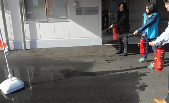 消火練習は、実際に訓練用消火器を使って、消火活動の一連の流れを