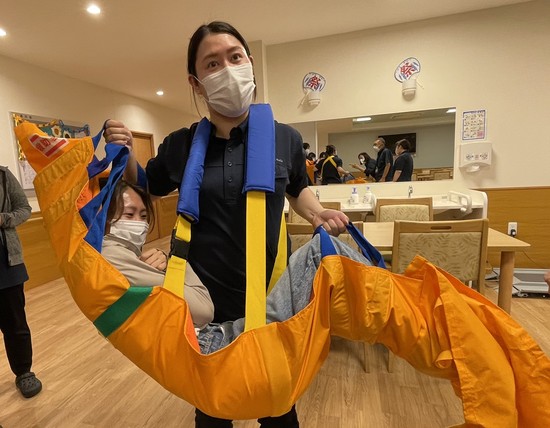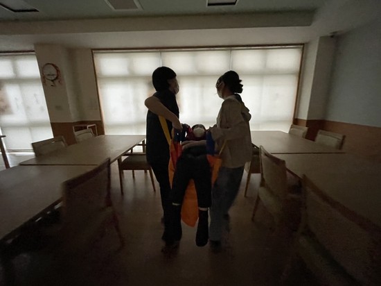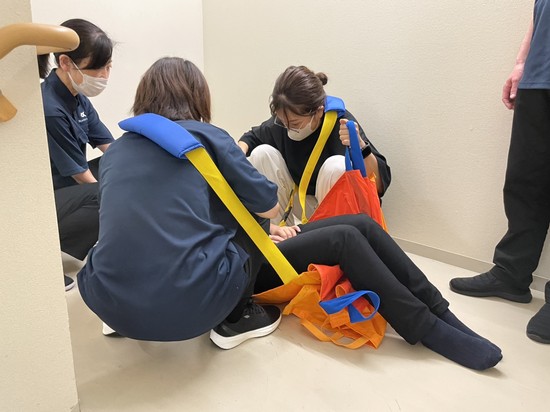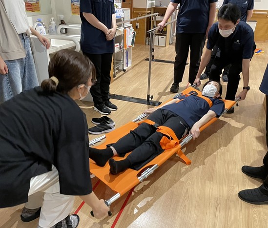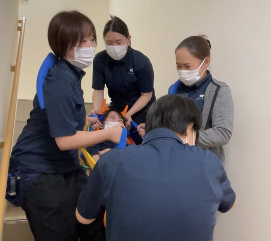 ③スタッフ数人で担架を持ち、階段の上り下りの実践を行いました。