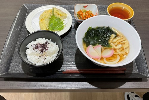 わかめうどん、さつま芋の天ぷら、ゆかりご飯、ごま酢和えでした。