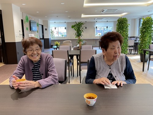 2024年01月28日(日) お買い物へ こんにちはアルファリビング吹田千里丘です。今日は天気が良く、お散歩がてらにお隣のコンビニへお買い物へお出かけしました。 各々、おやつや軽食を買いレストランでお茶会を行いました。 その後、世間話等で盛り上がりました。これからも お元気にお過ごしください。