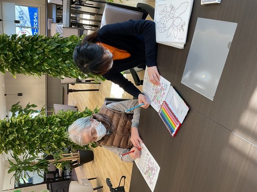 食事を終えた入居者様と看護師が熱心に塗り絵をしていました