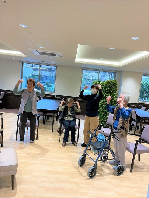 最初から最後まで、押し車を安全に持ちながらも、立って体操をされた入居者様がいらっしゃいました