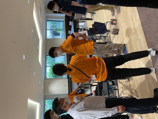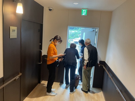 いつも歩行器を使われているご入居者様が職員と一緒に階段を降りて