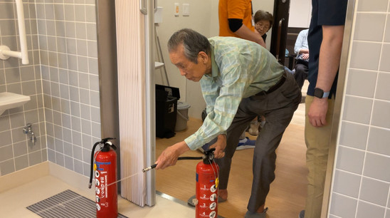 本日の天候が雨のため、特別浴室での消火器消火の体験となりました