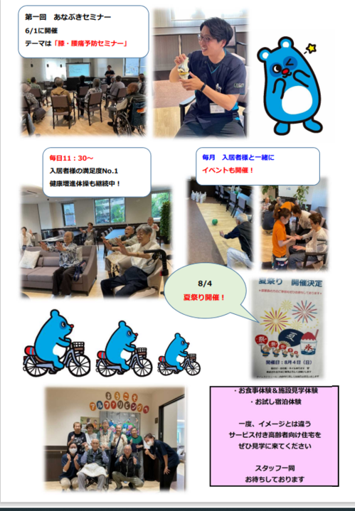2024年08月20日(火) アルファリビング吹田千里丘通信 バックナンバー③ 皆様こんにちは アルファリビング吹田千里丘です 開設して9か月が経ちましたっ サービス付き高齢者向け住宅ではありますが 入居者様の人生を最期まで寄り添っていくという思いのもと いろんな場所で発信を続けてきました その中で今回は医療対応や看護の対応を紹介しています ぜひまた御覧ください