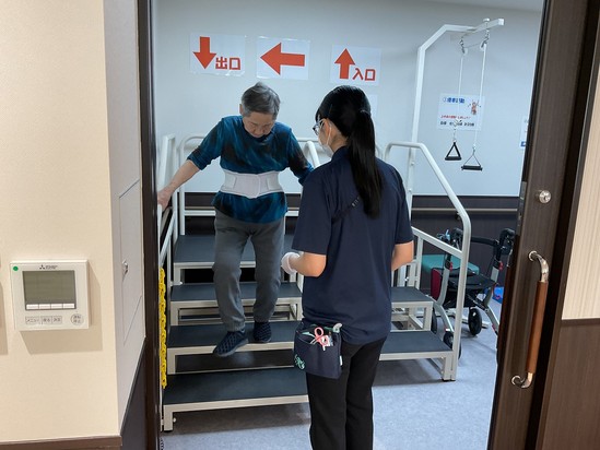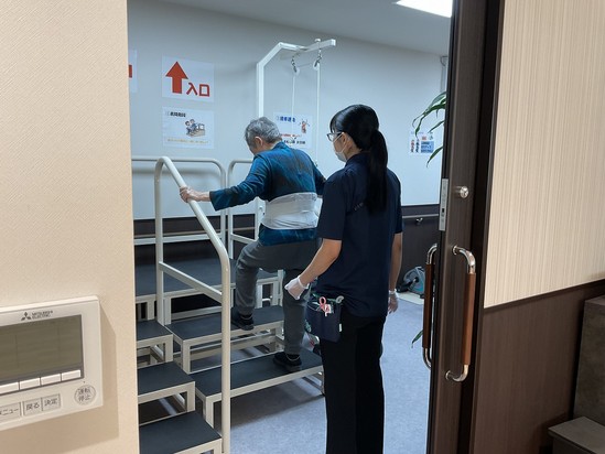 訪問看護にて多目的室での階段上り下りの練習しました。