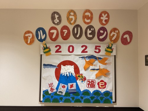 今月も入居者様と職員の共同作業で1月の壁飾りが完成となりました