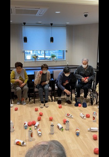 2025年02月22日(土) 2月レク、白熱、玉当てゲーム!! 今晩は~~アルファリビング吹田千里丘です2月レクでは 水の入ったペットボトル目掛けて、玉を当てて倒すゲームをしましたしかし・・・ただのペットボトルではありませんよ量がバラバラなんです 少ない水のものは倒れますが、たくさん入っているものは当てても当てても倒れません!!最後は野球経験者の入居者様が、命中させておられ拍手喝采でした