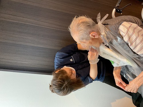 その後は、スワブというスポンジブラシを使用し、職員がしっかりと口腔内をきれいにし、肺炎に繋がらないようにケアさせていただいています。
