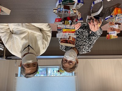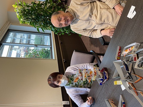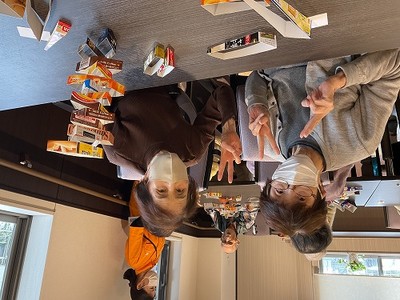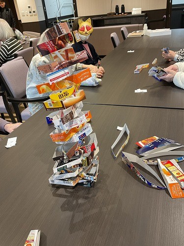 お菓子の空箱を不揃いに切った枠を積み上げていくゲームです 職員の子どもさんのおやつの好みがわかりました(笑)