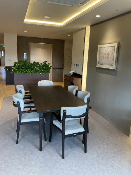 当施設では、各フロアにくつろぎのスペースを設けており、観葉植物がそっと彩りを添える優しい雰囲気の中で、皆さま思い思いにお過ごしいただいています。