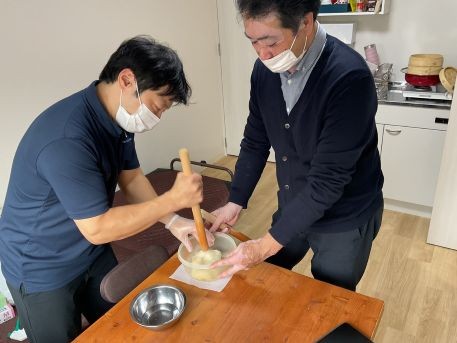 施設長とサービス提供責任者が息の合ったコンビネーションでお餅づくりをしています。