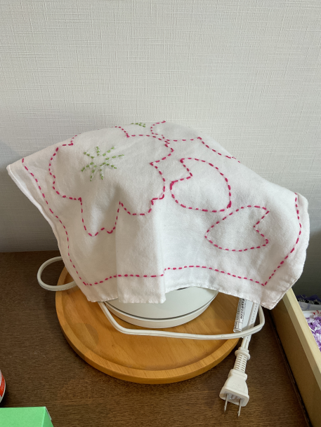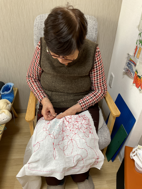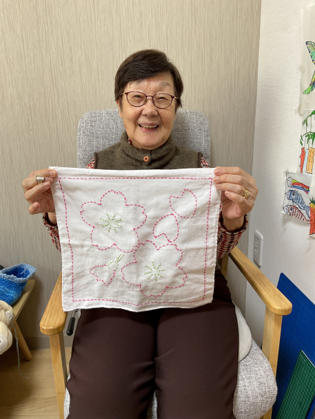 お部屋に入るたびにいつも入居者様は椅子に座って、花や草、動物の絵を丁寧に刺繡されています。