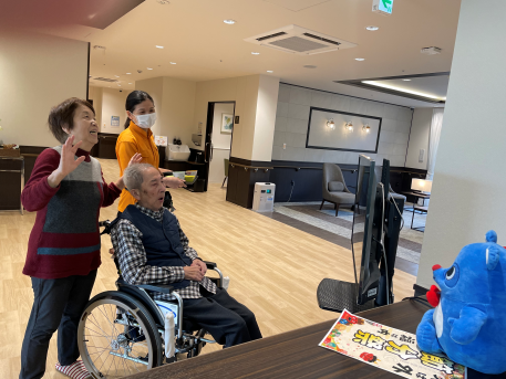 入居者様は奥様と一緒にモニターの前で、施設のお祭りで撮ったご家族の写真をご覧になり、。。