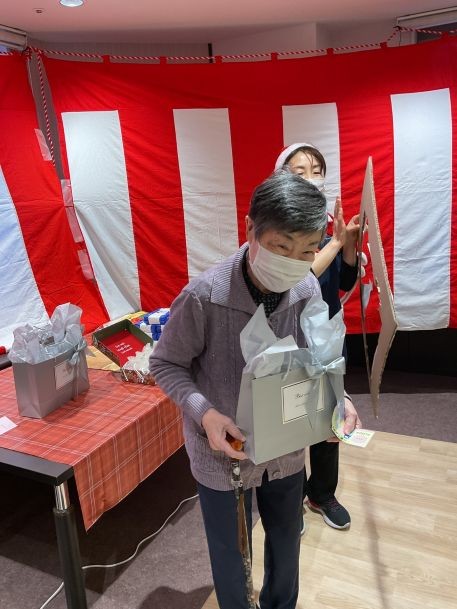 お餅つきの後、昼食で休憩をしていただき、午後からは宝くじ会が開催します。