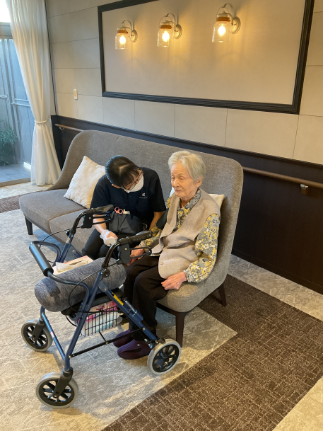 少しずつ元気に歩行器で移動できるようになっている利用者様